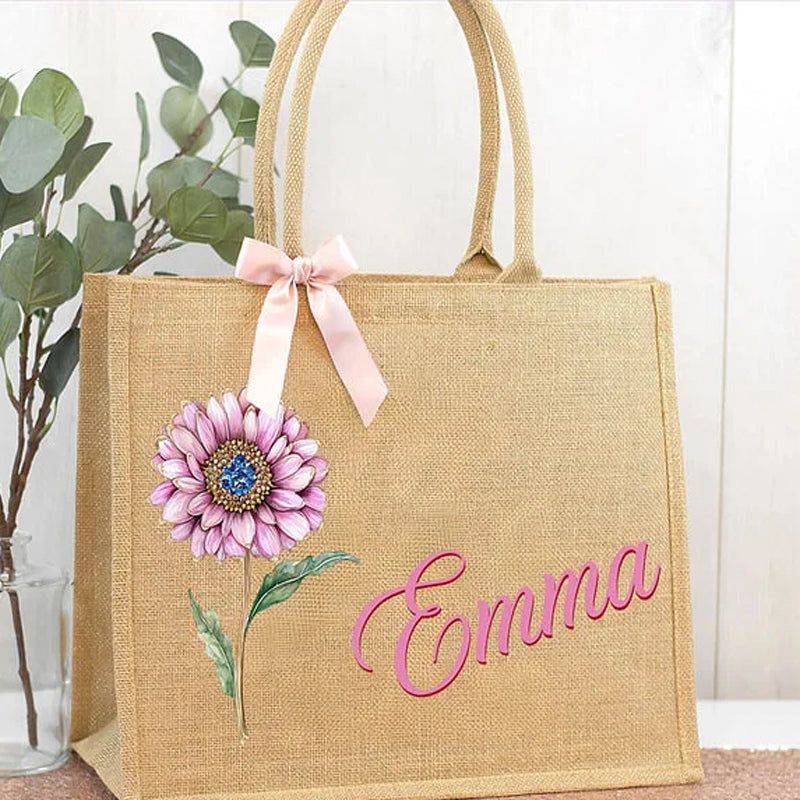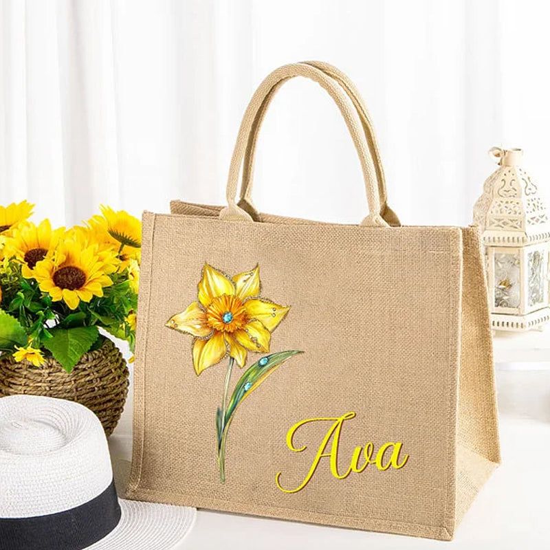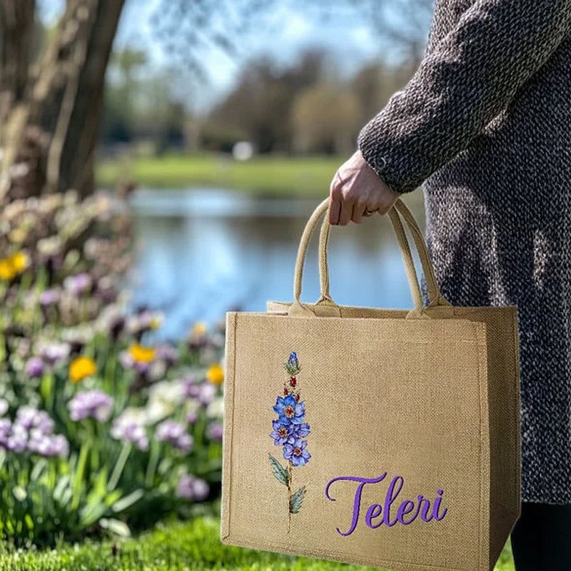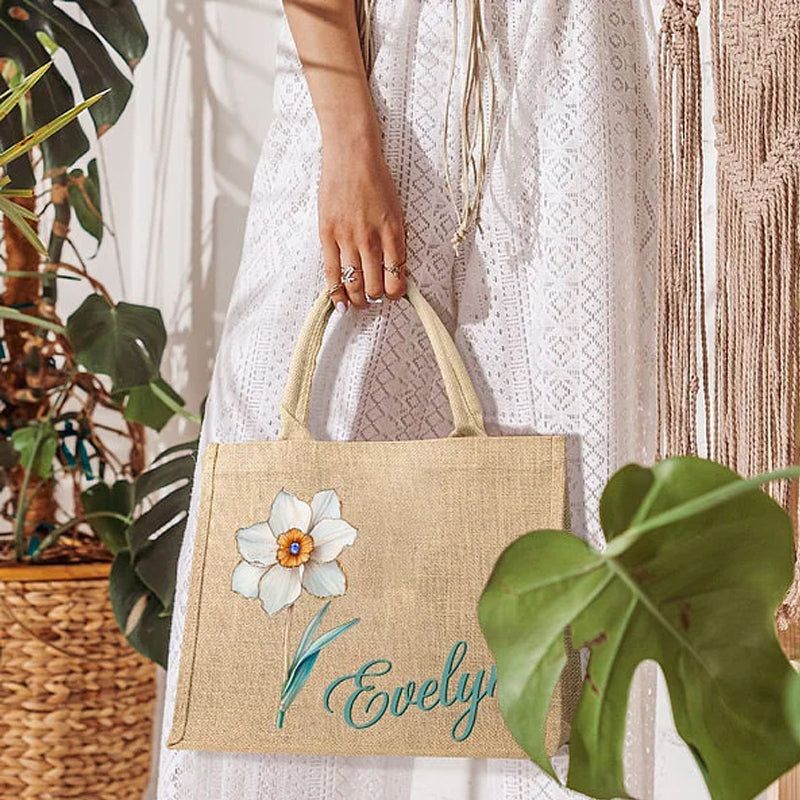 Custom Personalized Vintage Oil Painting Birth Flower and Birthstone Jute Tote Bag